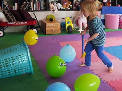 这个游戏需要一个气球靶,孩子们手持气球棒,站在一定距离外,瞄准气球靶投掷气球。这个游戏需要孩子们具备一定的瞄准能力和精准度,同时也考验他们的耐心和毅力。